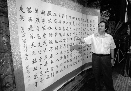 本报讯(记者 乔雪阳)昨天下午3点,成都知名书画家、汉高祖刘邦第73代后裔刘艺,在文殊坊成都会馆的二楼举行了他的个人书画展览。展览展出了刘艺的中国山水画作品14幅,书法作品25幅。