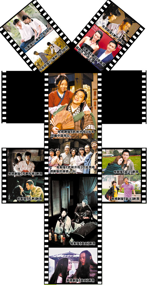 但在中国,影视作品的相互翻拍则是近年才出现的一个行业风潮,继电影《神话》之后,今年年初,电视剧《神话》也成为电视台的开年大戏,抢足风头,而改编自冯小刚2003年电影《手机》的同名电视剧在今年5月播出后名利双收。此外,小说《杜拉拉升职记》同时被拍成电影、电视,还搬上话剧舞台,让有的观众戏称“满眼杜拉拉”。