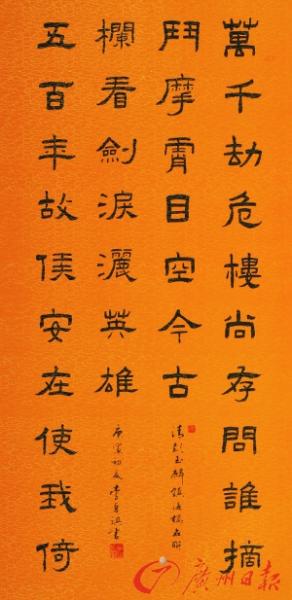 本报讯 (记者刘艳) 目前,《广州城标630周年庆——李卓祺书镇海楼名联诗词作品展》正在广州博物馆展出。此次展览分为两大部分,第一部分展出广州市书法家协会副主席、广东民间工艺博物馆馆长李卓祺书法对联作品43对,这些作品都是有关镇海楼的名联诗词,从书法艺术的角度展示镇海楼的历史。第二部分为名楼春秋,通过一系列镇海楼的老照片再现古楼的风雨历程,以及保护与利用情况。