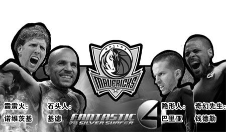 电影《神奇四侠》讲述了四名被赋予超人力量的宇航员,凭着他们的超能力,战胜Dr.Doom(末日博士)的邪恶计划,最终拯救地球的故事。在昨日进行的NBA总决赛第五场的比赛中,诺维茨基、基德、巴里亚、钱德勒就化身为“神奇四侠”率领小牛以112∶103战胜对手,顺利抢下“天王山之战”,在“烈火”中获得永生,目前小牛总比分以3∶2领先,只需再胜一场,他们就将历史上第一次捧起奥布莱恩杯。