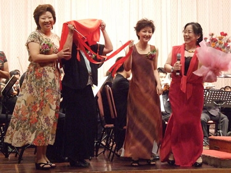 7月3日音乐会的开场曲,是张丽达专为爱乐女20年作的《抬花轿》,曲子刚刚结束,张女士就把郑小瑛请上台来,章红艳等人手拿红盖头,从台侧冒出来突然袭击,用盖头蒙住郑老师。“今年是郑老师80华诞,我们祝她生日快乐!”大家牵着老寿星的手,随着重新奏响的花轿曲摇摆着,舞到台中央。