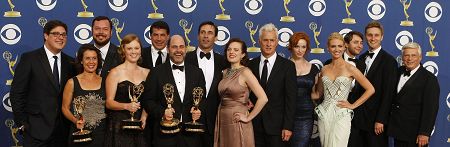 又是《广告狂人》,又是《我为喜剧狂》。这两部剧集从去年一直“狂”到今年,蝉联艾美奖最重要的剧情类最佳剧集和喜剧类最佳剧集。在感叹艾美奖了无新意的同时,不如回头看看提名名单,要找到能够与这两部“狂”剧竞争的作品还真不容易。除《广告狂人》外,其他获得剧情类最佳剧集提名的剧集为《大爱》、《绝命毒师》、《裂痕》、《双面法医》、《豪斯医生》、《迷失》。《大爱》讲述一个丈夫和三个妻子的摩门教家庭,《绝命毒师》是一部展现了身患癌症的化学教师如何变身大毒枭的黑色喜剧,这两部剧集题材新颖,但对于艾美奖而言,显然太过另类了。悬疑剧《裂痕》和《双面法医》的剧情固然引人入胜,但由于在有线电视台FX和Showtime播出,收视率平平,在经济危机尚未退去的当下,人们为保住饭碗提心吊胆还来不及,无心流连电视剧中的孰是孰非也不难理解。《豪斯医生》和《迷失》是所有获得提名的剧集中两部由公共电视台制作的剧集,收视率的排名也很靠前,不过,这两部剧集是艾美奖陪跑的“行家”,加上上季并无显著突破,获奖的可能不大。反观《广告狂人》,这部以广告业为背景的剧集把观众拉回纸醉金迷的1960年代。怀旧也好,麻醉也罢,抑或仅仅痴迷于