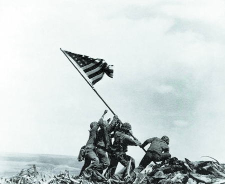 1945年2月23日,硫磺岛上战事正酣。美国海军陆战队第三师第二十八团二营E连哈罗德·希勒中尉率领的一支44人的小分队,一路血战,用手榴弹和刺刀消灭沿途日军,于上午十点三十分许终于冲上了硫磺岛制高点折钵山山顶。由于此时岛上战事还未结束,仍有日军负隅顽抗,美军特意在山顶竖了一面星条旗鼓舞了士气。希勒中尉小分队中的6名官兵奋力将这面大旗插上山顶,这一激动人心的场面正好被美联社的随军摄影记者乔·罗森塔尔拍了下来,这6名英勇的官兵是:艾拉·海斯、富兰克林·索思理、约翰·布拉德利、哈朗·布劳克、迈克·斯特兰克和雷内·加格嫩。
