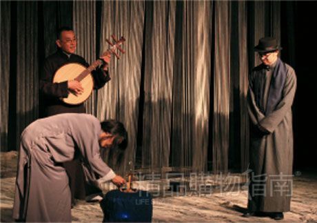 而为了让这个戏更加好玩,方旭还请来了两位“爷”——中阮演奏大师冯满天老师和中国曲艺团的三弦演奏家高建民老师,请他们来进行现场即兴的配乐。“阮有着非常丰富的表现力,非琴不是筝,暗藏吉他声。整体音乐气质与这部作品结合得非常完美。而三弦的声音透着地道的京味儿,阮和三弦在音色上的差别使音乐在戏剧演出过程中有了形象的特质。”