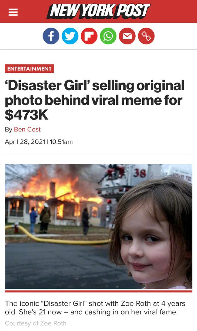 新浪娱乐讯 据外媒报道,多年前一位小姑娘在火灾现场回头微笑的照片在网上走红,被改成各种表情包广为流传,江湖人称“disaster girl”。十多年过去后,长大成人的小姑娘把原版照片拿出来拍卖,最终被人以47万3千美元的价格买走(约300万人民币)。