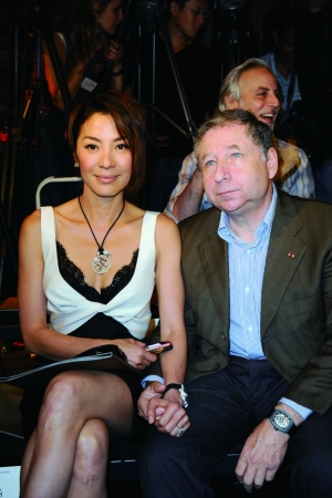 杨紫琼和法拉利车队总监简·托德在巴黎甜蜜亮相,共同参加08-09巴黎秋冬高级定制时装周的某品牌秀。当天,杨紫琼一身黑白相间的紧身短裙显得既华贵又性感,小麦色的皮肤与胸口的黑色蕾丝令人眼前一亮,但更亮眼的则是她左手无名指上价值100万美元的蓝色钻戒。不仅如此,二人还带着同款的情侣手表……好事将近,难怪杨紫琼脸上的微笑比全身的钻饰还吸引人。
