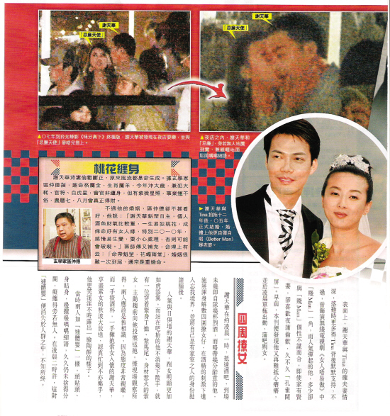 谢天华与Tina拍拖12年间鲜有绯闻传出,2005年,他花费百万元迎娶女方过门,席上并自弹自唱英文情歌《Better Man》,以好男人自居。事实上,谢天华已不是第一次这样夜蒲泡女孩子。2007年,他到台北录制《味分高下终极踩台》时被发现夜蒲,并与年仅19岁的“忌廉天使”麦皓儿打得火热。