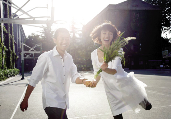 除了结婚声明,经纪公司还提供一组结婚照,新郎新娘没有穿礼服,而是穿着生活装,拍摄地点是两人的母校中央戏剧学院。照片上可以看到,袁泉左手无名指上的戒指闪闪发亮。