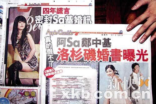这是今年香港娱乐圈最具戏剧性的一个事件。3月27日,香港某报曝光郑中基和阿Sa2006年结婚的结婚证书,傍晚6时30分,两人携手在香港九展举行记者招待会,承认结婚,并表示两人离婚程序正在进行中。