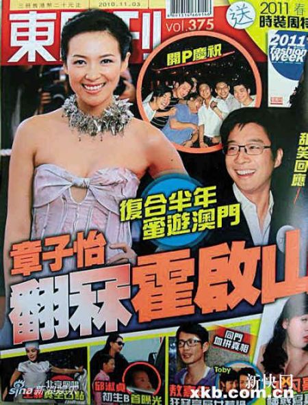11月2日出版的某香港平面杂志爆料称章子怡与前男友霍启山已于半年前复合,并称两人被目击蜜游澳门。报道指两人自分手以来,四年间一直保持好友关系,不时会互通电邮、短信问候对方。事后章子怡只表示,两人一直是朋友。