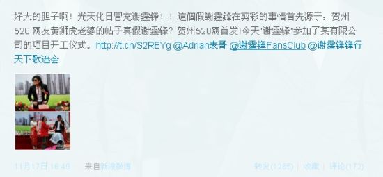 “被忽悠了,好大的胆子啊,光天化日之下冒充谢霆锋。”昨日,一条“谢霆锋近日在贺州参加某公司开业仪式”的消息在微博上传播开来,被网友疯狂转发,但细心的网友发现此人并非谢霆锋本人,这条消息恰好被谢霆锋的经纪人霍汶希(微博)看到了,霍汶希昨日在微博发出声明,她表示英皇公司会保留法律追究权利。