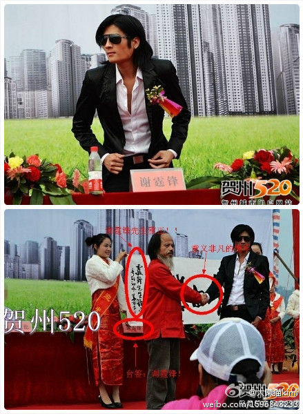 黑色西服配白色衬衫,一头乌黑的中分长发,戴着标志性的墨镜……昨日有网友在论坛和微博报料,“谢霆锋”在贺州参加了某有限公司的项目开工仪式,但山寨谢霆锋的事实让所有期待的观众的热情一下子干瘪了下来,失望和愤怒交集在一起,被忽悠了!