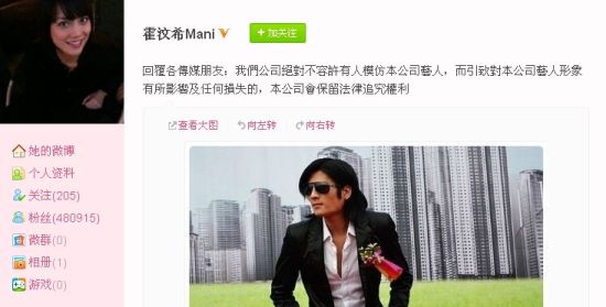昨日18点16分,谢霆锋霍汶希通过微博转发了网友“大懒猫kimi”关于谢霆锋遭遇恶意模仿的微博,并附上生气的表情评价到,“这样的事情我会处理的”。19点11分,霍汶希正式在微博上发表声明“回复各传媒朋友:我们公司绝对不容许有人模仿本公司艺人,本公司会保留法律追究权利”,并且贴上谢霆锋被模仿的图片,作为警告。