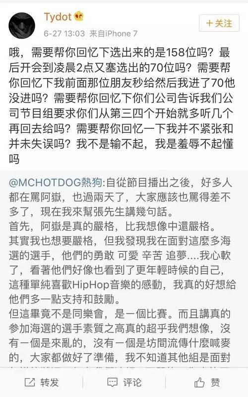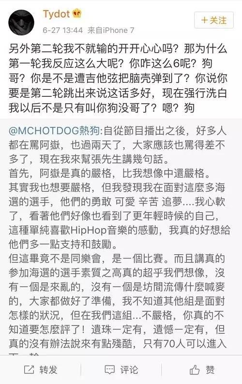 也难怪第一期结束后没多久就有选手微博抨击节目组,抨击张震岳,还顺带抨击了一下热狗。