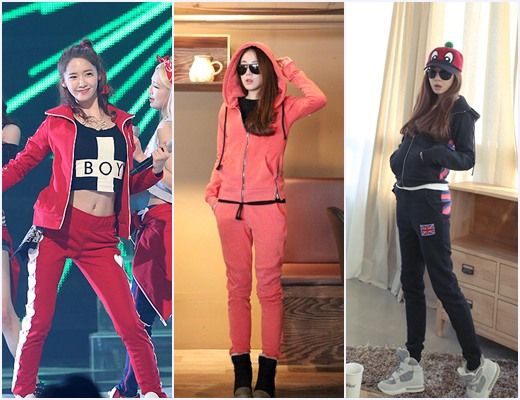 允儿在露腹肌的抹胸T恤上穿了红色修身运动裤展现了魅力十足的面貌,如果说H形线条的运动裤是过去的人气单品,那么时下的潮流单品可以说是修身轮廓哦。