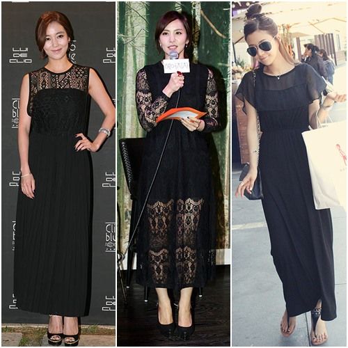 本季最流行蕾丝元素的长裙款式。演员李素妍选择的单品是肩部蕾丝设计的黑色长裙,凸显了神秘性感范儿。而KBS主持人朴智允以透视蕾丝设计的黑色长裙,展现出隐隐约约的性感魅力。