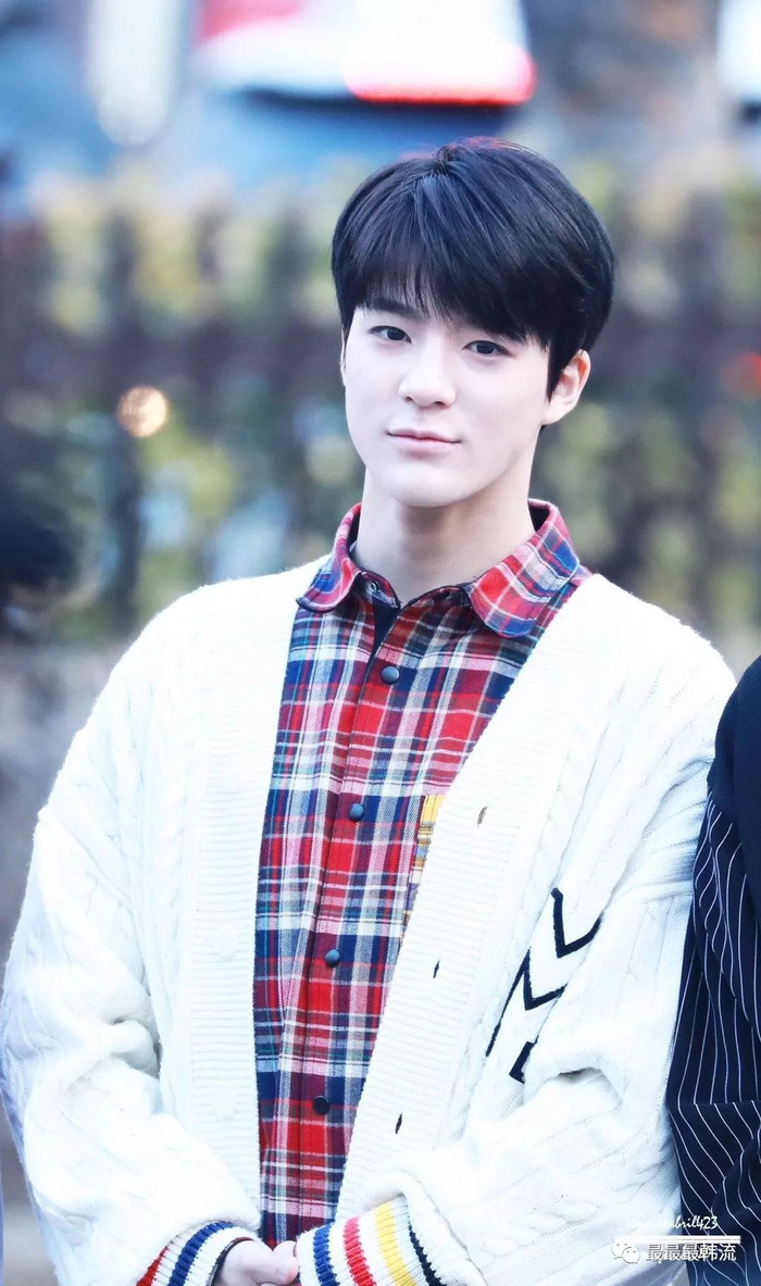 昌珉小哥哥呢,选了一套棕色搭配,木质气息浓厚。棕红拼接的毛衣,深棕色外套,浅棕色裤子,白鞋。很温柔的一套穿搭。