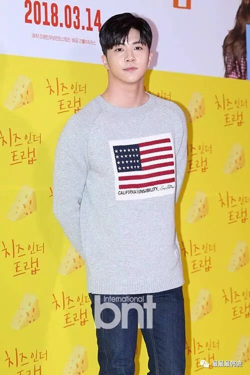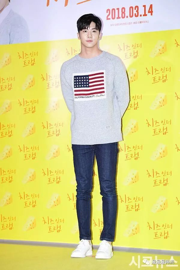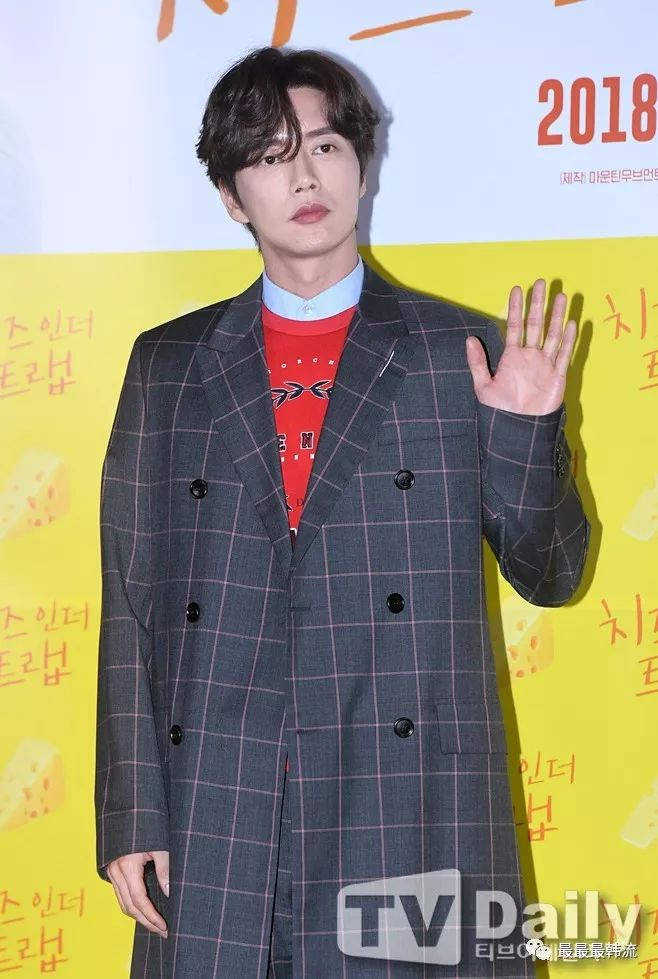 朴海镇出席了影版《奶酪陷阱》的发布会,淡蓝衬衣,红色印花毛衫,灰色格子大衣和灰色格子裤子,运动鞋。
