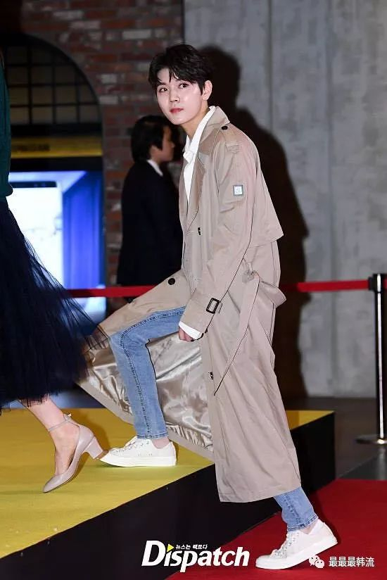 允浩哥哥选了白T,深色牛仔裤,小白鞋,棕红拼接的外套。非常利索成熟的一套,颜色配的也好看,不会显老~