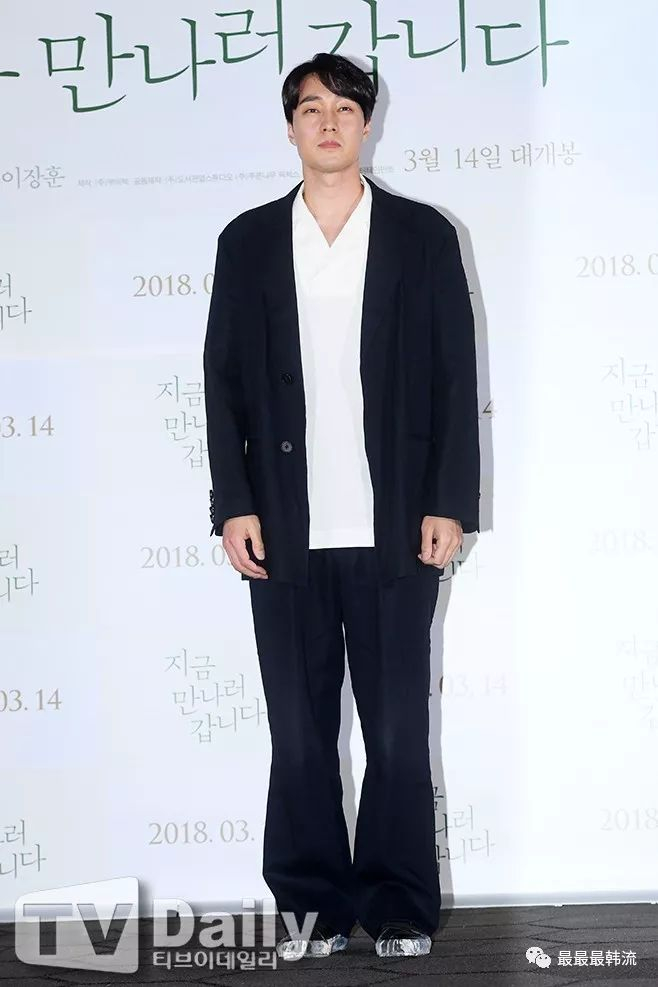 郑振永的试映会look选了深蓝色翻领大衣,黑裤,黑皮鞋。