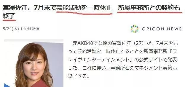 前AKB48成员兼演员宫泽佐江近日通过所属事务所宣布,将从7月起暂停演艺活动,同时结束与事务所的经纪合约。