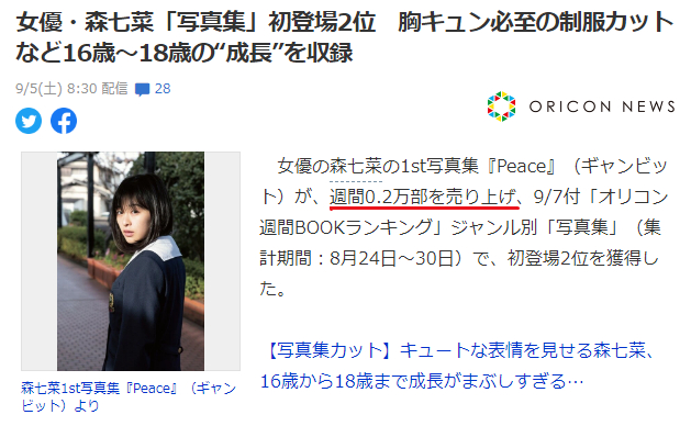 在今年发行了写真集的森七菜,第一天就卖出了2000册。但在公司宣传通稿上,却被写成了首日大卖0.2万册。一字之差就让整个销量逼格上升不说,更是让森七菜被冠上了人气保证的光环。从某个方面来说,贵社的文字游戏玩的倒是炉火纯青啊。