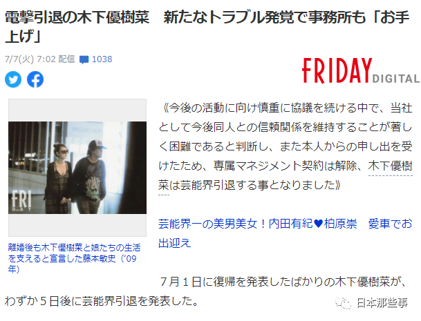 7月7号,她宣布退圈的第二天,又被曝出来她不止跟一个男人保持着不伦关系,她还跟一个大公司的男团成员有一腿。据《文春》消息,木下优树菜跟公司坦白了和这个男团成员的一切,公司觉得已经没办法继续包庇她了,所以才跟她解约。后来的新闻还不断曝出她的恋爱关系,她的第三个、第四个情人接连被曝了出来。