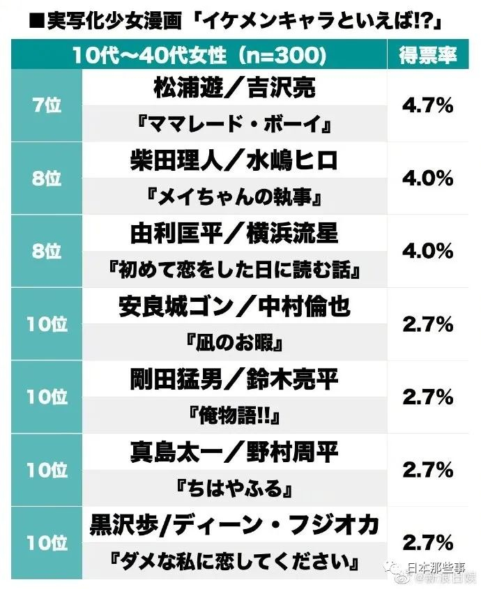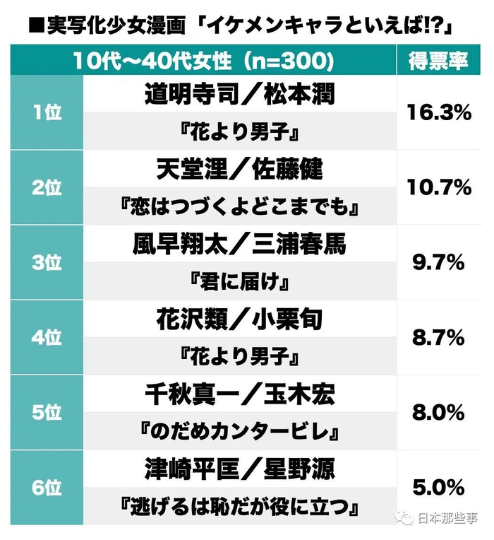 在众多版本的“道明寺”里面,松本润版简直就是永远的神!樱花妹给出的投票理由包括“《花样男子》是奠定松本润人气的作品”“不是松本润的话,这部作品不一定能有这么红”“我就是看了《花男》才饭上松本润的”。