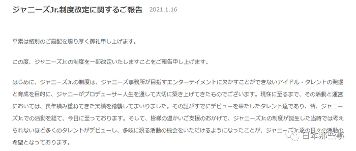 这篇公告有关杰尼斯Jr的制度改革,简单来说就是,以后Jr到了22岁还无法出道的话,杰尼斯会给他们一段时间思考,允许他们在这段时间内随时解约,当然了,如果杰尼斯方面觉得对这个Jr不满意,应该也可以跟他们提出解约。