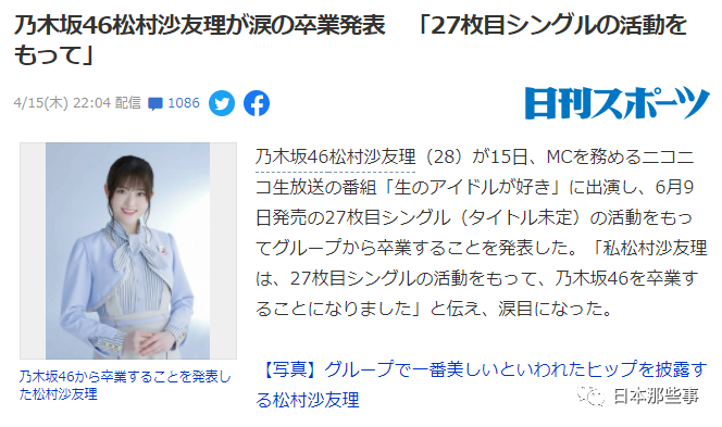 昨晚上,乃木坂46的成员松村沙友理在参加《喜欢活生生的偶像》节目直播时,突然宣布了毕业消息,