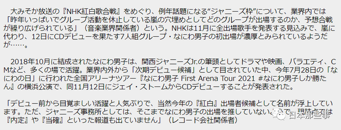 另外,在今年红白候选的问题上,媒体称尽管今年的红白有“减少杰尼斯出演比例”的倾向,但业内人士普遍看好浪花男子今年登上红白,