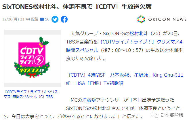 时间快到年底,圣诞也将近,各大音番都在热热闹闹开唱中,20日晚上就有《CDTV》的圣诞特别节目播出。
