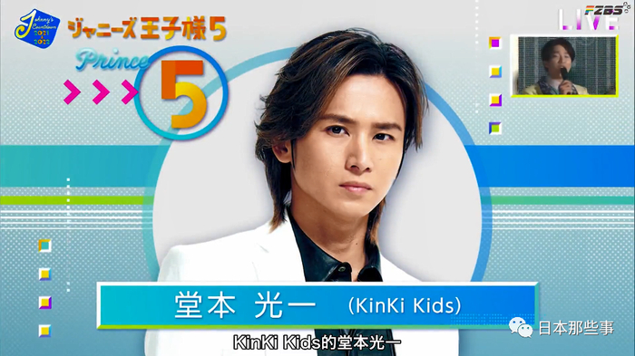 堂本光一成功入选了“王子”部门的第五名,除了他是40代以外,剩下的都是10代、20代的后辈们。