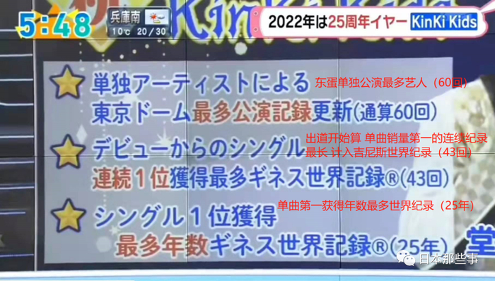 KinKi Kids的团活方面,单曲销量第一的吉尼斯世界记录不断被自己更新,目前为止也是在东京巨蛋开演唱会场数最多的艺人,这些数字无不显示出组合的巨大影响力。