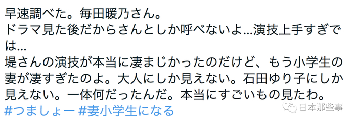 我看了这部电视剧。设定很不可思议,从扮演变成小学生版石田百合子的每田暖乃身上,我只能看到石田百合子的身影。说话的方式和行为简直就是身体里住着石田百合子的小学生。