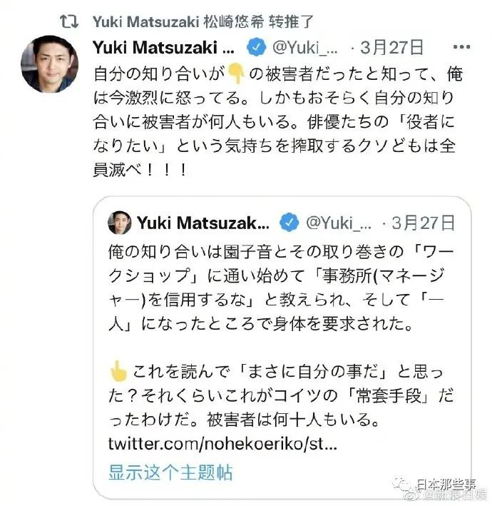 松崎悠希当时表示已经联系《周刊女性》,鼓励受害者站出来说出自己的遭遇。