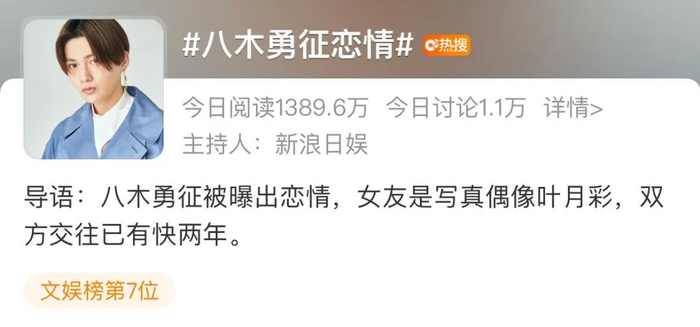 没想到去年年底才在中国走红,八木勇征4月就因为谈恋爱而上了热搜,有不少粉丝直呼塌房。