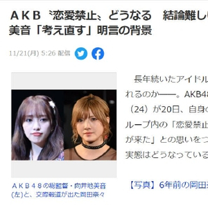 据悉,此前,AKB的成员冈田奈奈被曝和男演员恋情。AKB48的总监督向井地美音于20日更新个人社交平台表示“重新思考“恋爱禁止”真正含义的时代到来了”。