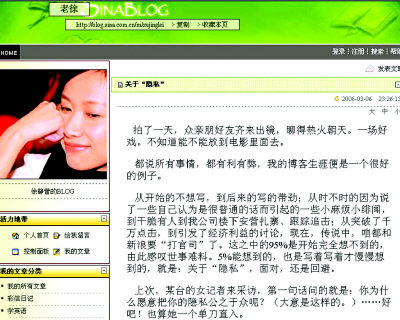 最近半年,徐静蕾(点击进入徐静蕾的blog)的新闻总是会伴随着另外两个字的出现———“博客”。没有出演任何影视剧、没有导演新作的徐静蕾,博客突破了千万次点击率大关,一夜间登上各大报刊的头条,接着与韩寒(点击进入韩寒的blog)的博客调情事件又闹得沸沸扬扬,随后又有众多广告商想在“老徐”上打广告,出版社要给徐静蕾出博客书。虽然徐静蕾一再强调不是在自我炒作,但实际效果似乎比有计划的炒作更好。