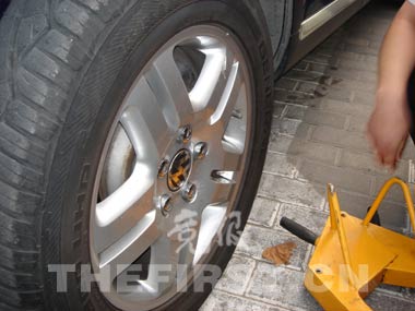 本报记者丁博摄影报道 因没将车停在规定位置,郑钧(blog)的大众途锐被SOHO现代城的保安人员锁住,并造成车辆损坏。昨天,郑钧在和现代城的物业公司“城市绿洲”协商未能达成协议后,准备将物业公司告上法庭。
