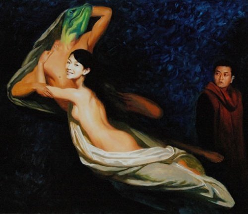 记者在网站看到这幅徐静蕾的裸体油画,老徐上半身至臀部完全裸露,只披一件薄纱,她侧身抱住一个青蛙脑袋人身的怪物。不远处,王朔身穿红衣,回头凝视他们。这幅油画的作者,正是恶搞名人油画系列创作者安迪。对于为何选择画徐静蕾,安迪说:“徐小姐属于智慧型女性,智慧女性多是端庄典雅,很少有裸体。经常裸的明星,画起来反而没意思。”安迪表示,徐静蕾与裸体,正是追求反差效果。他认为,作品是对徐静蕾的一种美化。