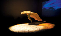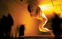 叶锦添此次个展将今日美术馆超高的展厅巧妙地利用起来,从入口处被包裹成一个巨大的“黑盒子”,唯一的光线将集中在长达8米,高度近3米的雕塑《浮叶》之上。与之呼应,有投影装置表现树影的斑驳,还有阳光或是月光的闪烁,“影”的效果将被无限放大;另外一件作品是4×6米的雕塑《夔》,看上去那是一个奔跑或逃逸的男人,残缺而有力度的腿部留给人无限的想象。在今日美术馆的三层和四层展厅,叶锦添还铺陈着几十幅摄影作品及雕塑《原欲》、装置《等待室》等,这些作品组成了一个巨大的私密化的空间和类似戏剧化的舞台,带领观众从黑暗之处穿越现在和未来。