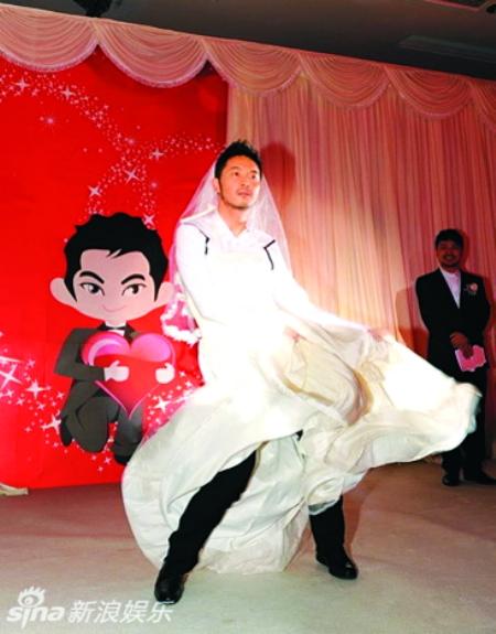 通常都是新娘子穿婚纱,这次沙溢居然披着头巾,穿着一身雪白的婚纱跳着轻快的舞步出场,不时拉起裙摆扭动屁股,像模特走秀。跳到舞台上之后,还大方地跳起舞动裙纱跳起探戈,随后又做出跳芭蕾舞的动作,搞笑的动作让现场嘉宾忍俊不禁。据记者了解,这套婚纱是沙溢自己挑选的,由于版型偏瘦,沙溢一度还担心自己穿不进去。当另一位司仪刘仪伟采访他的时候,沙溢才假装委屈:“其实这是我老婆逼着这么做的,同时也是送给所有嘉宾的一个惊喜,希望大家能够在快乐中度过这个时刻。”