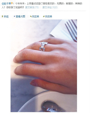 赵子琪在博客上秀钻戒。她得意洋洋的姿态激怒了许多网友:“今年年末,上帝重点奖励了那些真实的、无畏的、敢爱的、有种的人!你收到了奖品吗?”