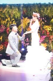 华西都市报记者现场看见:当“王宝器”单腿跪地,将一枚数万元的钻戒戴在了精灵妹李昕灿手上,精灵妹当着上千嘉宾亲朋的面,羞涩地表示愿意成为“王宝器”的妻子时,“王宝器”突然当众惊叫唤地大喊:“谢谢老婆同意今天嫁给我,我要永远爱你!”