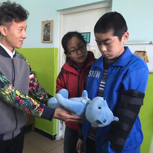 新浪娱乐讯 昨天下午,青年舞蹈家朱晗和演员王碧儿小姐来到位于北京双桥的北京星星雨教育研究所,看望在这里上学并接受康复治疗、干预的自闭症儿童,有2-12岁的小班和12-18岁的大班,这些孩子都是生活中在自己的世界里,与其他同龄的孩子有很大不同,但是在星星雨学校,他们得到了来自社会各界更多的关爱和帮助。朱晗和王碧儿还带来了纯植物染色的小熊送给每一个小朋友,跟他们交流,去感受他们所在的那个世界。