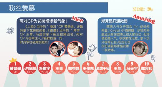 粉丝爱慕榜方面,《上瘾》当中的“海因”CP黄景瑜、许魏洲拿下花榜前两名,《逆袭》当中的“青宇”CP王青、冯建宇拿下第三和第四名。两对CP为榜单注入了新鲜血液,同时竞争也会更加激烈!此外,韩国人气女子组合f(x)成员郑秀晶(Krystal)开通微博,尽管郑秀晶还没有在微博上和大家互动,但凭借超高人气,收获鲜花无数,拿下该分榜第五名。粉丝们也在盼望着郑秀晶发第一条微博。