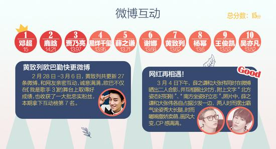 再来看微博互动和提及,2月28日-3月6日,黄致列共更新27条微博,和网友亲密互动,诚意满满。欧巴不仅在《我是歌手》的舞台上取得好成绩,也收获了一大批忠实粉丝,本期拿下互动榜第7名。3月4日下午,薛之谦和大张伟同时在微博晒出二人合影,并互相圈出对方,附上文字“北方姿态好阳刚”、“南方坐姿好立志”。照片中,薛之谦和大张伟各自占据沙发一边,两人时而摆出霸气坐姿秀大长腿,时而嘟嘴撒娇卖萌,画风大变,CP感满满。