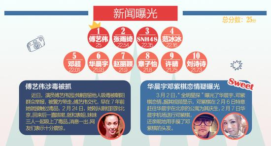 第21期榜单即前一周数据汇总结果(2016年2月29日0:00时2016年到3月6日23:59时),除了统计明星前一周的新闻曝光量,还将依托微博数据,对微博搜索热度、互动指数、提及数、粉丝爱慕(送花)指数进行统计,几项指标按相应权重比换算累计,最终结果生成总榜排名。