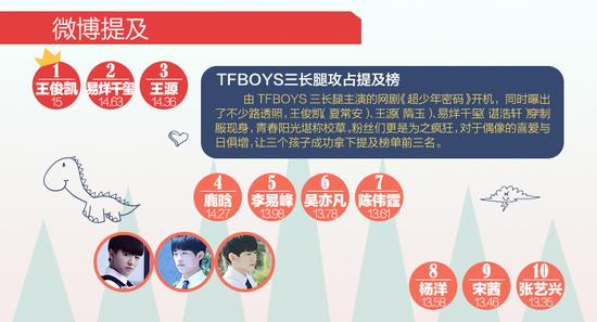 由TFBOYS三长腿主演的网剧《超少年密码》日前开机,同时曝出了不少路透照,王俊凯(夏常安)、王源(隋玉)、易烊千玺(谌浩轩)穿制服现身,青春阳光堪称校草。粉丝们更是为之疯狂,对于偶像的喜爱与日俱增,让三个孩子成功拿下提及榜单前三名。